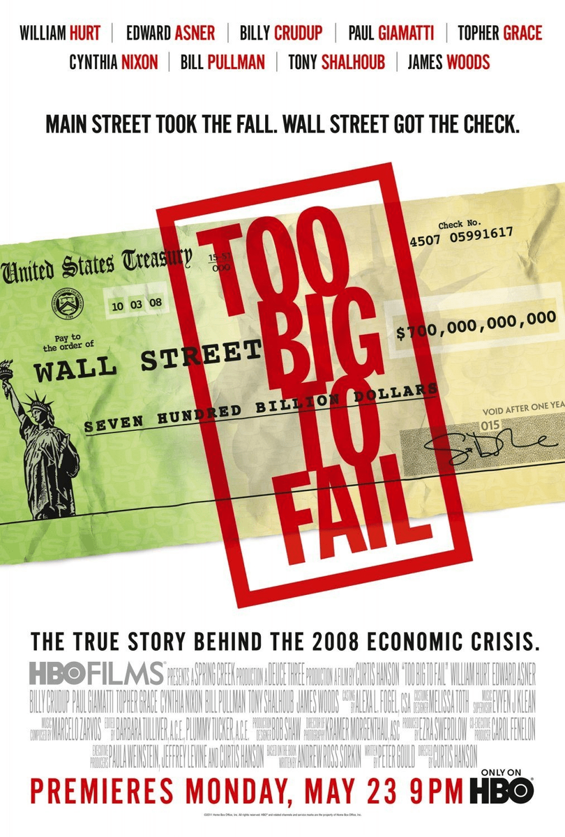 «Слишком крут для неудачи» — основанный на реальных событиях фильм режиссёра Кёртиса Хэнсона, вышедший на экраны 23 мая 2011 года. Снят по мотивам документальной книги Too Big to Fail Эндрю Росса Соркина. Получил множество положительных критических отзывов, а также 11 номинаций на телепремию «Эмми» и 3 номинации на премию «Золотой глобус». Wikipedia Один из самых интересных фильмов о кризисе 2008 года. В фильме показаны действия директоров банков, федеральной резервной системы, правительства, инвесторов, которые столкнулись с результатами бесконтрольного раздувания цен на недвижимость. «Свой дом — это часть американской мечты» Дж. Буш. «Дома всегда дорожают» Каждый мечтает о своем доме, и в один прекрасный день банк одобряет ипотеку на его покупку. Долго ли мы радуемся новому дому? Конечно, но еще дольше мы радуемся тому, что с каждым годом купленный в ипотеку дом дорожает, а если он дорожает — значит его можно продать и купить другой дом побольше. А может не продавать и сделать его за