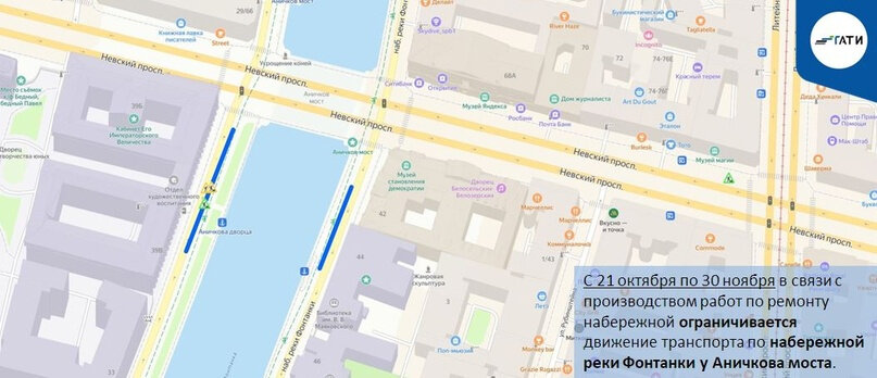 Проезд по набережной Фонтанки ограничат до конца ноября Ремонт дороги и набережной, а также работы на коммуникациях с 21 октября изменят схему движения в четырех районах Петербурга: Центральном, Невском, Петроградском и Кронштадтском. Об этом 19 октября предупреждает пресс-служба Государственной административно-технической инспекции. До 30 ноября ограничат движение по набережной Фонтанки у Аничкова моста. Там будут ремонтировать набережную. На проспекте Обуховской Обороны отремонтируют дорожное покрытие. С 21 октября по 22 ноября там ограничат проезд по участку от Смоляной улицы до Общественного переулка, включая перекрестки. На Петроградской стороне водителей потеснят, чтобы сделать врезку в газопровод и восстановить благоустройство. С 21 по 30 октября для этого ограничат движение по улице Графтио от Каменноостровского проспекта до тупика. В Кронштадте для реконструкции тепловой сети с 21 по 22 октября перекроют движение на перекрестке Посадской и Андреевской улиц. Напомним также, что
