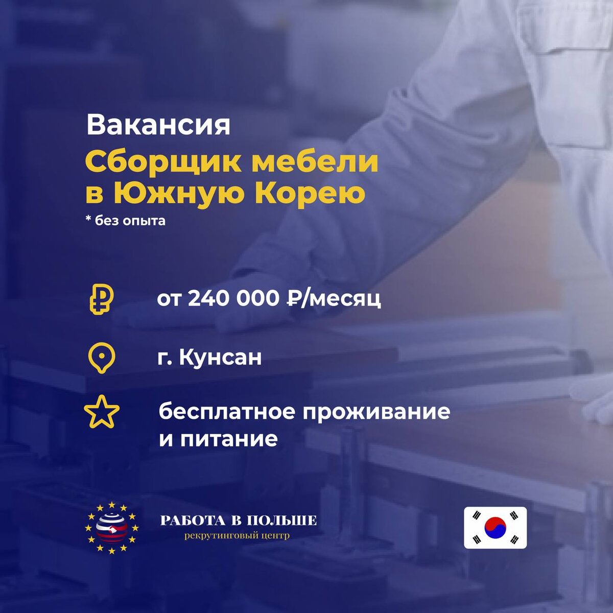 Что нужно будет делать? 💥 Погрузочные работы 💥 Сбор/доставка мебели до адреса клиента 💥 Установка мебели 💥 Обязательное умение пользоваться электроинструментом Какие условия? ✔️Город работы: Кунсан ✔️Средний заработок в месяц от 250 тысяч рублей ✔️Опыт работы и знание языка не требуются ✔️Отправка осуществляется еженедельно (в удобный для вас день) ✔️Срок пребывания в стране от 3-х месяцев до 2-ух лет; ✔️ Заключаем договор - вылет - встреча с работодателем; ✔️ Проживание и питание предоставляется ✔️ Условия отличные. Оформление и вылет в течении недели ✔️ Рабочий день 8-10 часов/ 5-6 дней ✔️ На протяжении всего вашего пребывания, мы и русскоязычный куратор на связи Какие требования? ❗️Заграничный паспорт Где жить? ☑️ Проживание и питание предоставляется ☑️ Проживание общежитие, квартира. Комнаты по 2 чел. Вода, стирка, тёплый пол, душ, туалет, wi-fi; ☑️ Для более подробной консультации обращаться по телефону или в офис нашей компании. ☑️ Оформим в кратчайшие сроки. Подберем подходя