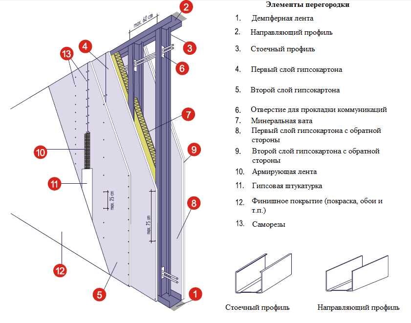 Конструкция перегородки из гипсокартона состоит из следующих основных элементов: