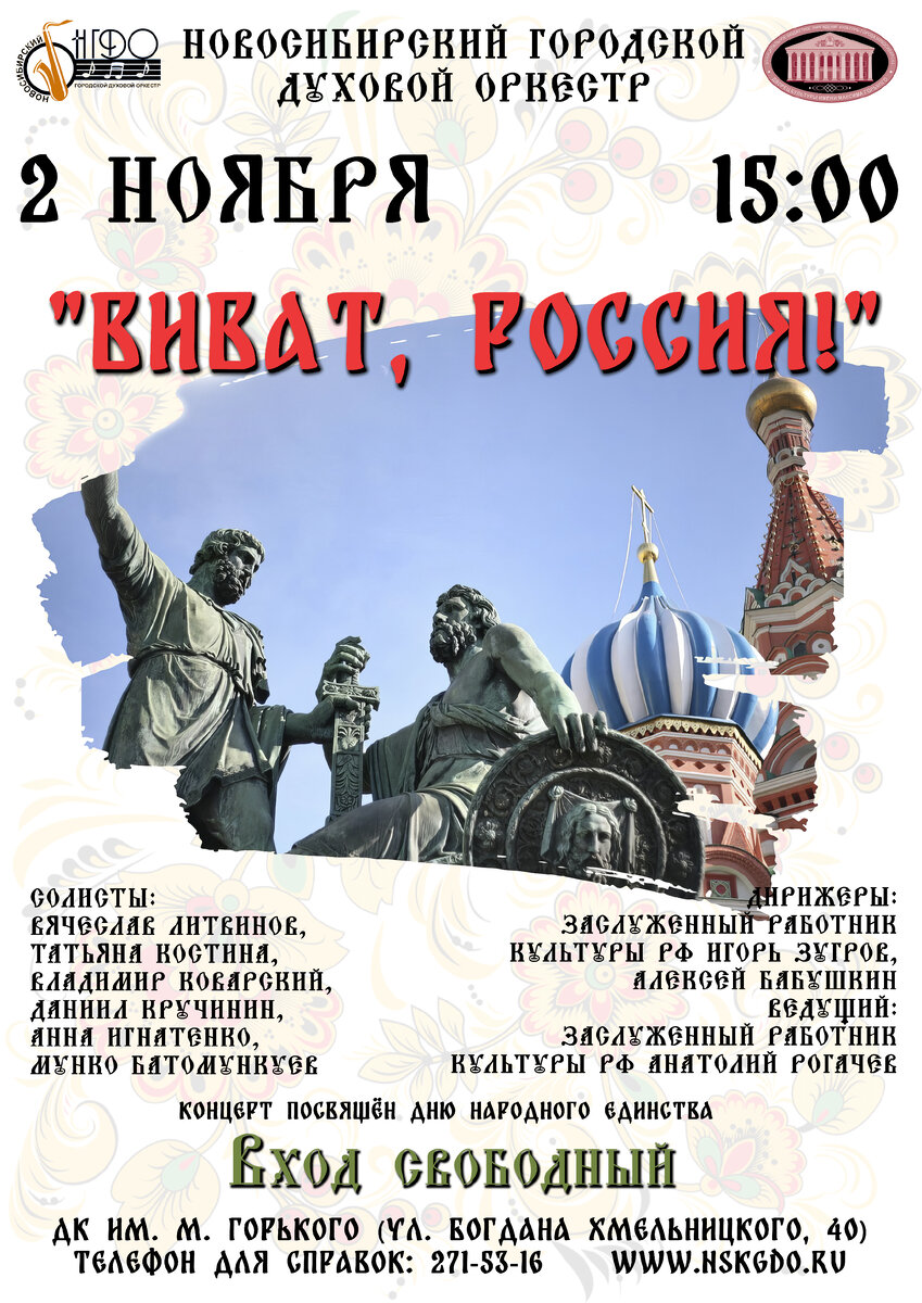 2 ноября Новосибирский городской духовой оркестр приглашает на концертную программу, посвящённую Дню народного единства - "ВИВАТ, РОССИЯ!". День народного единства занимает особое место среди государственных праздников современной России. Он связан с событиями 1612 года – подвигом наших предков, которые сплотились во имя свободы и независимости Родины. Это праздник взаимопомощи и единения. В исполнении солистов и инструменталистов оркестра прозвучат музыкальные произведения из к/ф «Освобождение» , «Щит и меч», «Новые приключения неуловимых», а также всеми любимые песни композиторов М. Матусовского, А. Островского, В. Шаинского, А. Эшпая, Ю. Саульского. 2 ноября, 15:00, ДК им. М. Горького (ул. Богдана Хмельницкого, 40). Вход свободный! Телефоны для справок: +7(383)271-53-16; 271-30-68.
