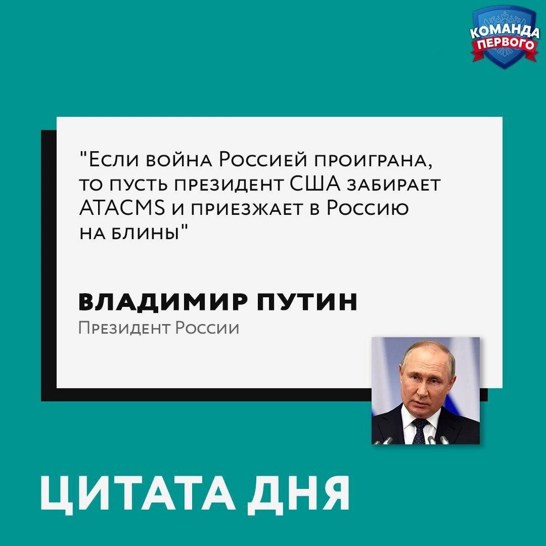 #КомандаПервого ⚡️️⚡️⚡️ Владимир Путин назвал смешными утверждения о том, что Россия "проигрывает войну" на Украине Так он прокомментировал недавние заявления лидера США Джо Байдена. По словам Владимира Путина, если бы России было нанесено поражение, то США не продолжали бы поставлять Украине новое вооружение, в том числе дальнобойные ракеты ATACMS.
