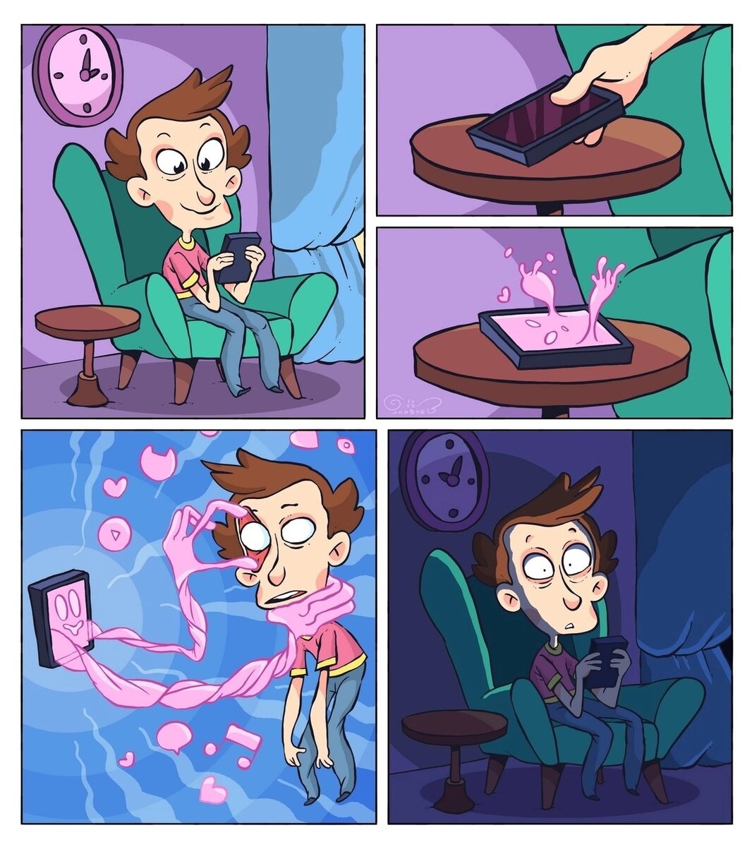 Сейчас многим будет уже сложно представить себе жизнь без смартфона, но еще совсем недавно у нас не было под рукой устройства, помогающего в любой момент связаться с нужным человеком, найти полезную информацию и развлечь себя, когда скучно. Но сейчас владение смартфоном уже успело стать повседневностью. А все, что становится повседневностью, всегда превращается в расхожую тему для шуток. Так что сегодня я решил собрать для вас десятку отличных комиксов про телефоны - тут будет и про функции смартфонов, и про их влияние на человека. Надеюсь, что вам понравится! Российский художник Евгений Яковлев давно занимается комиксами - он создает как объемные произведения в этом жанре, так и и небольшие комикс-стрипы. В последних чаще всего нет слов, но понять их легко можно и без этого. Отличный тому пример - комикс ниже. В комиксах российского художника под псевдонимом proidemtes часто оживают предметы, а животные ведут себя слишком уж похоже на людей. Но картинка, попавшая в эту подборку, все-т