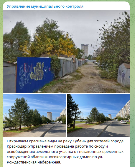 Как стало известно 20 октября, накануне управление муниципального контроля администрации Краснодара отчиталось о работе по благоустройству территории в Юбилейном микрорайоне города. Но опубликованные фото, якобы показывающие работу «до» и «после», по словам краснодарцев, были сделаны в разных местах. В тг-канале управления муниципального контроля накануне появился пост следующего содержания: «Открываем красивые виды на реку Кубань для жителей города Краснодар! Управлением проведена работа по сносу и освобождению земельного участка от незаконных временных сооружений вблизи многоквартирных домов по улице Рождественская набережная. Сегодня на территории, где ранее стояли демонтированные сооружения, раскинулся живописный сквер, который прекрасно дополняет общую красоту набережной». Сообщение подкреплялось фотографиями в стиле «до» и «после». На первой были запечатлены старые железные гаражи, неасфальтированная улица и хаотично растущие деревья. На других фото красовалась широкая благоустро