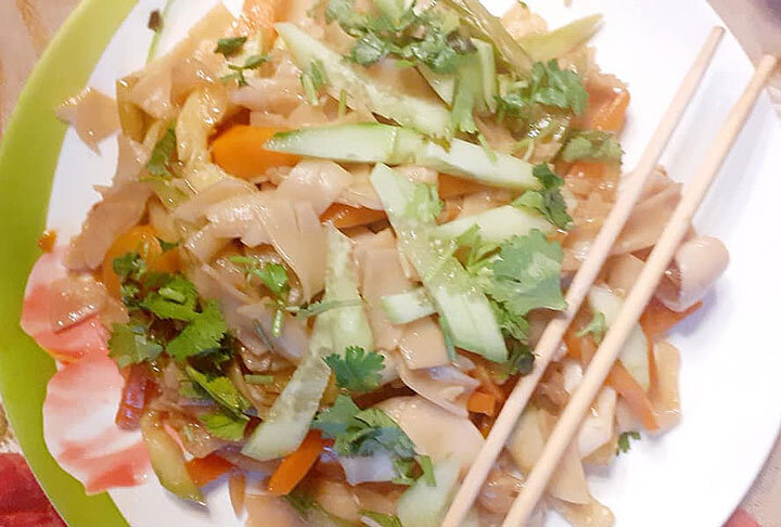 ✓ Перец чёрный молотый, перец чили – по вкусу (можно прямо в тарелку при подаче) При желании можно добавить 1 ст. л. устричного или рыбного соуса. Суть заключается в очень быстрой термической обработке. Гораздо больше времени занимает подготовка. Очищенные кальмары положить в кипящую воду. Варить после закипания 4-5 минут, не больше. Все ингредиенты нарезаем соломкой средней толщины. Чеснок и имбирь - мелко. Берём сковородку «вок», или любую толстостенную глубокую сковороду, или сотейник. Наливаем масло, раскаляем, как для плова, кидаем лук, постоянно помешиваем в течении 1 минуты. Затем чеснок и имбирь, 30 секунд постоянно помешивае
