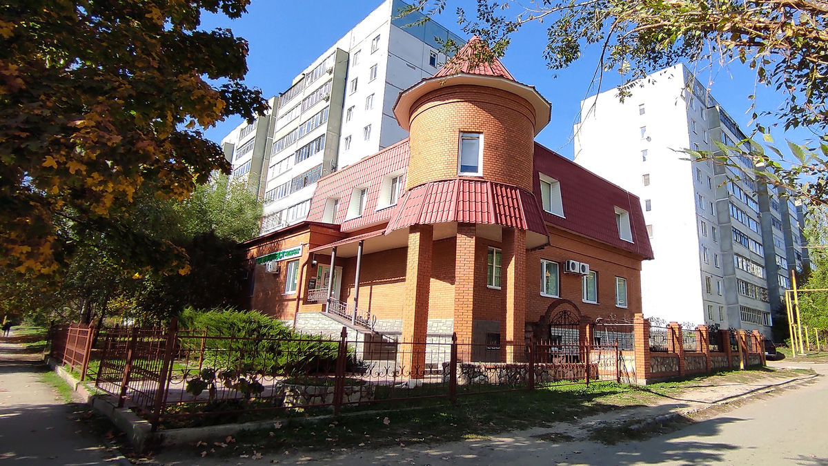 Офисное здание на проспекте 50 лет Октября с круглой башней, похожей на Барабакан - это не единственное строение в городе, где использованы архитектурные элементы средневековых замков или городских укреплений. В этом же Юго-Западном районе (Монгора) есть детский сад похожий на средневековую крепость. Внешнее фортификационное сооружение Барбакан, расположенное над воротами или мостом, предназначалось для дополнительной защиты входа в крепость, обеспечивало круговой обстрел осаждающего крепость врага. Вот и эта башня, вынесенная за пределы основного фасада, как бы прикрывает собой всё строение и подходы к нему. Расположившись между стандартных девятиэтажек, дом с башней , окружённый небольшим двориком с газонами и кованным ограждением, создаёт необычную романтическую атмосферу среди обычного спального района. БЛАГОдарю, что дочитали статью до конца ! Буду рада вашему лайку 👍 и подписке на канал.