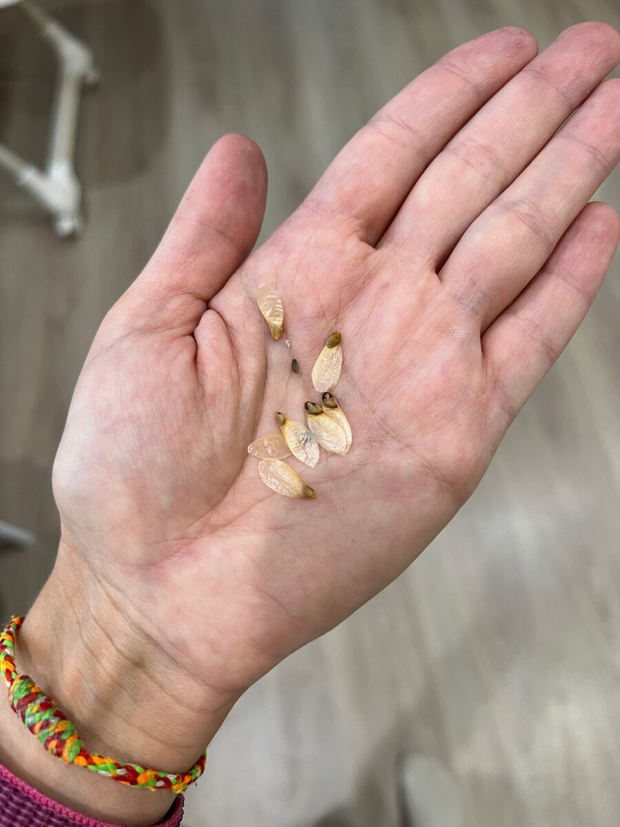 Начну я с того, что много читала разных статей, о том как вырастить елку из семечки. Столько различных описаний и так много «танцев с бубнами», и заморозка семян, и строго сбор шишек в феврале. Но у нас всё вышло иначе. Как-то в начале октября мы с дочкой гуляли по деревне и собирали шишки, прошу заметить уже раскрывшиеся, с елок. Так вот, пару шишек мы принесли домой, бросили их возле батареи. Так они пролежали у нас дня четыре. Конда я решила прибраться и переложить шишки в другое место, из них посыпались семена. Фото приложу как они выглядят. Я их собрала в горсть и натыкала в горшок с землей. У меня пустовал горшок и я решила воспользоваться этим. Посмотреть, что же будет дальше. Потому как ранее уже встречалась с людьми, которые также вырастили елку в горшке, а по истечению трех лет, высадили елки уже в землю на участке. Далее я пролила землю водой и как-то на полторы недели забыла о то что посадила семена. В очередной раз поливая свои домашние цветы, я вспомнила, про эти семен