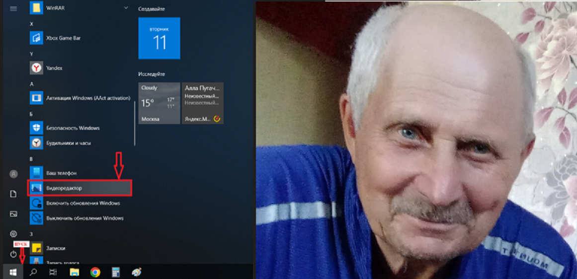 Открываем меню Пуск клавишей «Вин» (флажок), расположенной в нижнем ряду клавиатуры между клавишами «Ctrl» и «Alt». То же самое можно сделать щелчком левой кнопки мыши на кнопку Пуск, расположенную с левой стороны панели задач. Спускаемся вниз, находим пиктограмму «Видеоредактор»: