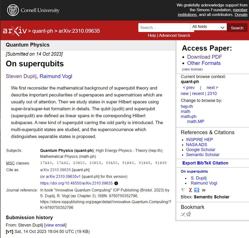 Только что вышла наша статья "О суперкубитах"/"On superqubits" S. Duplij, R. Vogl https://arxiv.org/abs/2310.09635. Прямая ссылка на PDF: https://arxiv.org/pdf/2310.09635.pdf. Абстракт. Мы пересматриваем математические основания теории суперкубитов и описываем важные характеристики суперпространств и суперматриц, которые обычно остаются без внимания. Затем мы подробно изучаем состояния в супергильбертовых пространствах, используя формализм супер-бра/супер-кет скобок. Кубиты (кудиты) и суперкубиты (суперкудиты) определяются как линейные оболочки в соответствующих гильбертовых подпространствах. Вводится новый вид суперкубита, нечетный. Исследованы мультисуперквантовые состояния и предложена суперконкурентность, отличающая сепарабельные квантовые состояния. Статья принята к публикации в книге "Innovative Quantum Computing" IOP Publishing (Bristol, 2023) by S. Duplij, R. Vogl (as Chapter 3). https://store.ioppublishing.org/page/detail/Innovative-Quantum-Computing/?K=9780750352796