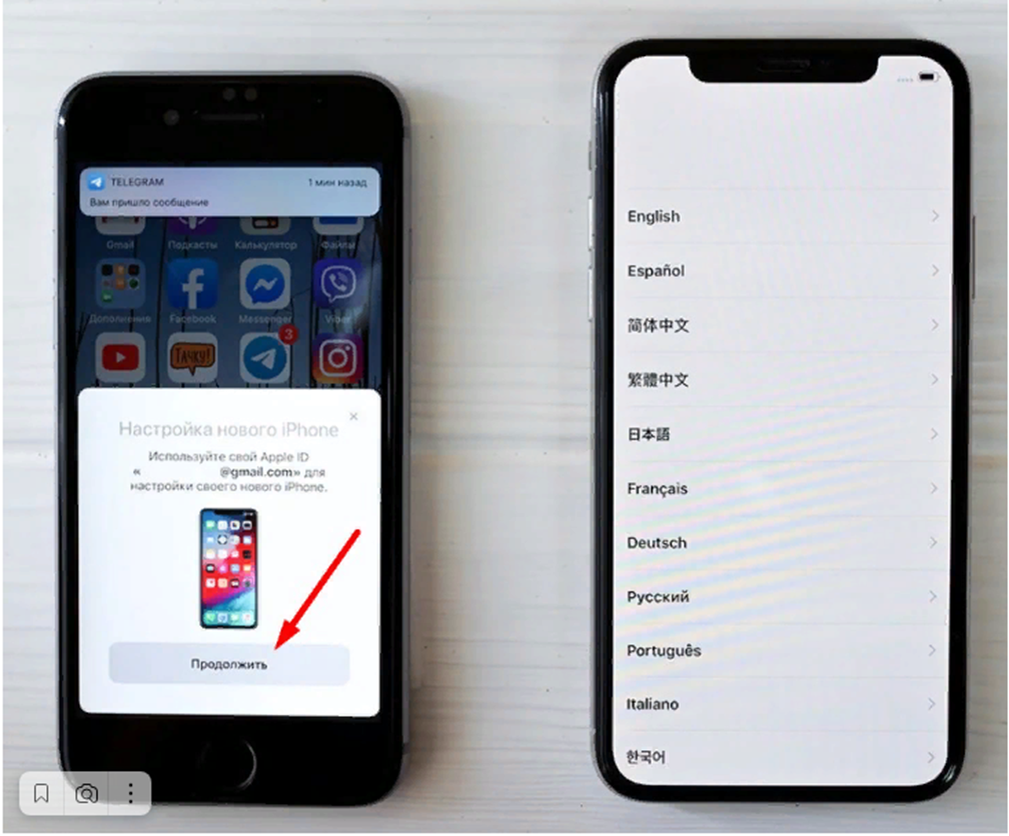 1. На старом телефоне проверяем функцию «ЛОКАТОР» 2. Откройте приложение «Настройки». 3. Нажмите [ваше имя] > «Локатор». 4. Нажмите «Найти [устройство]», затем нажмите, чтобы выключить эту функцию. 5. Введите пароль идентификатора Apple ID. 6. Нажмите «Выкл.». 7. ЭТО ДЕЛАЕТСЯ ДЛЯ ПРОВЕРКИ ПРАВИЛЬНОСТИ ПАРОЛЯ APPLE ID 8. Включаем новый телефон. 9. Располагаем два аппарата рядом друг с другом (старый и новый). 10. Проверяем заряд аккумулятора на двух телефонов должно быть более 80% или можно подключить к источнику питания. 11. Выполните инструкции на экране нового телефона (выбор языка, регион), чтобы начать. 12. Включаем Bluetooth и Wi-Fi на старом iPhone, чтобы появилась кнопка передачи данных; 13. Расположите устройства рядом друг с другом, и на экране старого айфона появится предложение передать данные: 14. 15. Нажмите кнопку «Продолжить» на старом айфоне, а на новом выберите нужный вам язык и страну. 16. После чего на старом айфон появится кружок, в который с помощью камеры нужно по