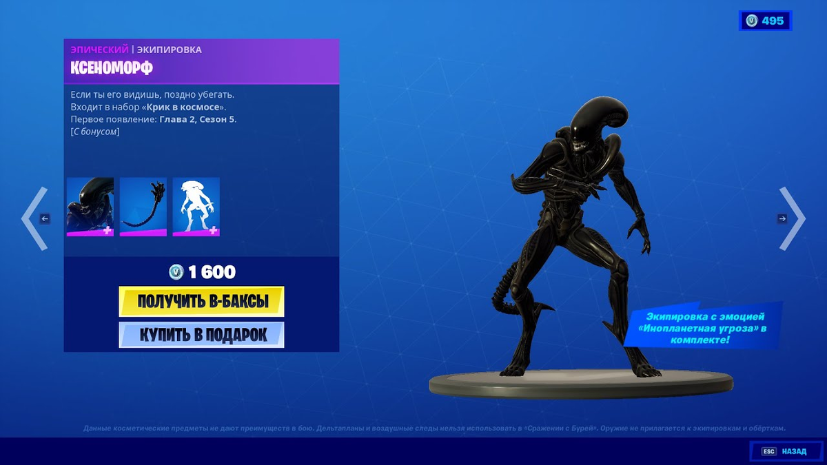 Скин “Ксеноморф”: можно купить во внутриигровом магазине. Экипировка стоит 1600 в-баксов