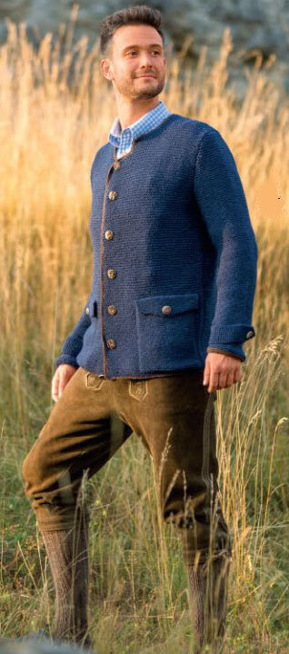Классический мужской жакет-янкер без воротника и с застежкой на пуговицы в фольклорном стиле сегодня может похвастаться актуальными деталями: патами на рукавах, накладными карманами с клапаном и отделкой по краю контрастным кантом.
