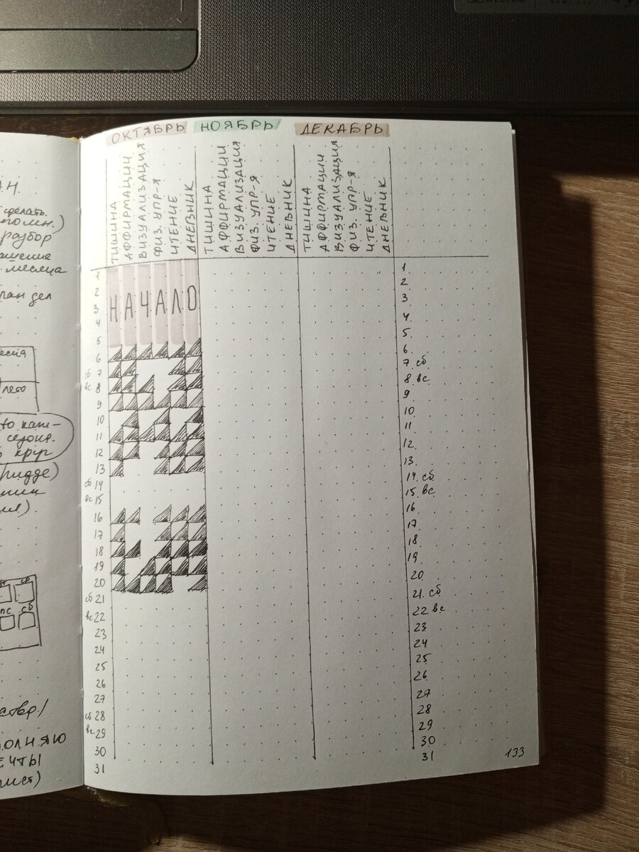 Добрый день, друзья! В планах на октябрь у меня стояло - вернуться к ритуалам "Магии утра" на постоянной основе. И пообещала вам подробнее рассказать, как только это снова войдет в привычку. Начала я с 6 числа. Начертила в своем ежедневнике таблицу до конца этого года, где отмечаю выполнение. По времени на это уходит у меня полчаса, пока остальные еще спят. Будильник ставлю на 6.00, но иногда просыпаюсь сама, еще до того, как прозвенит сигнал. Чтобы не поддаться искушению перевести будильник на попозже, сразу встаю и иду умываться. С вечера оставляю на кухне свои книги и блокноты, ставлю рядом свечу и наливаю стакан воды, чтобы утром не тратить на это время. А теперь о самих практиках: *** Первой идет "Тишина" (примерно 5 минут) - это состояние спокойного созерцания. Открываю шторы и смотрю на погоду за окном или пью воду и смотрю на пламя свечи. Можно закрыть глаза и помедитировать, если хочется. Это позволяет организму проснуться окончательно. *** Затем я открываю свой дневник дл