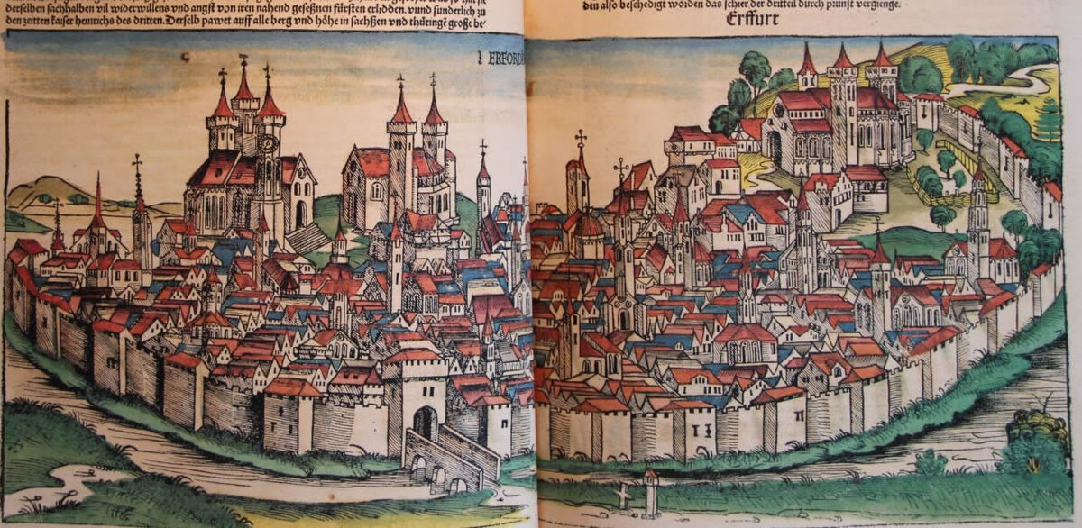 Перед вами гравюра из Нюрнбергской хроники 15 века с изображением германского города Эрфурт. Это очень старый город в Тюрингии. Сейчас он является столицей этой области.