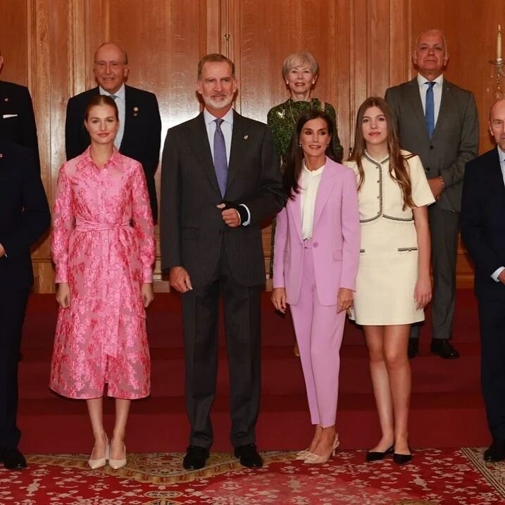 После концерта, состоявшегося вчера вечером в зале Дворца конгрессов, устроила традиционный официальный прием победителям Премии принцессы Астурийской 2023 года в зале Covadonga отеля Hotel de la Reconquista в Овьедо. На ней присутствовала вся королевская семья Испании. Женская половина семьи продемонстрировала три стиля. Сама Летиция выбрала костюм-двойку нежно-лилового цвета от бренда Hugo Boss, сшитый на заказ. Старшая, принцесса Леонор - в розовом платье Хавьера Симорры. На фото не видно, но пишут, что оно полупрозрачное. Младшая, инфанта София выбрала костюм с мини-юбкой от Sandro. На аудиенции все с удовольствием пообщались с американской актрисой Мэрил Стрип. Впереди нас ждёт самая интересная церемония вручения премии принцессы Астурийской.