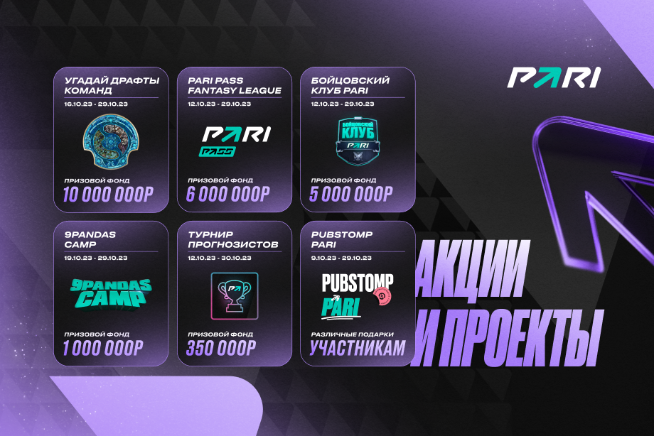 12 октября стартовал чемпионат мира по Dota 2 – The International 2023. Чтобы просмотр турнира получился более насыщенным и увлекательным, букмекерская компания PARI запустила ряд активностей для русскоязычных поклонников киберспорта. Выполнить задания от Алексея Solo Березина, собрать команду мечты, провести дуэль между Invoker и Pudge, почувствовать себя капитаном и посмотреть финал TI в кинотеатре – всё это болельщики смогут сделать благодаря акциям от PARI. Вместе с началом TI12 в PARI Pass стартовала Fantasy League с ежедневными наградами. На каждый игровой день The International 2023 пользователи могут собрать свою дрим-тим – чем лучше выступят её участники, тем больше баллов они принесут. C 12 по 29 октября пользователи PARI могут поучаствовать в «Бойцовском клубе» в стиле Dota 2. Игроки сражаются в файтинге за героев «Доты» и получают фрибеты. Общий призовой фонд акции равен пяти миллионам рублей. До 30 октября также идёт турнир прогнозистов PARI Esports. В специальном боте п
