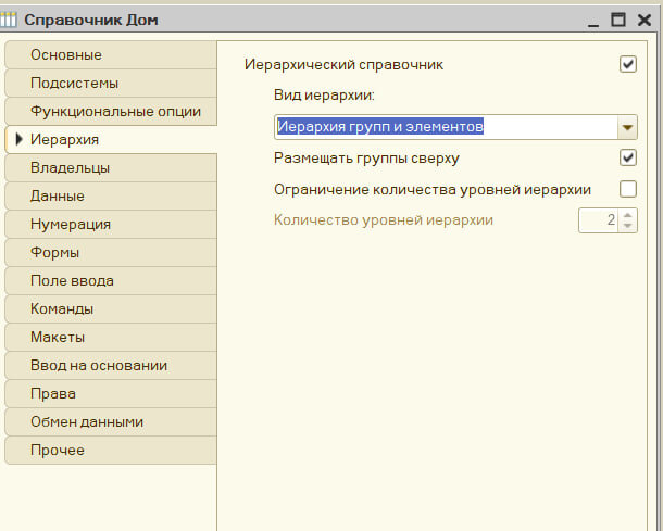 В справочнике Дом выполняем следующий порядок: Иерархия, Активируем Иерархический справочник, Выбираем Иерархия групп и элементов. Теперь заходим в Данные, Стандартные реквизиты и Наименованию присвоим синоним Часть квартиры. Сохраним изменения и запускаем отладку и перейдём в 1С:Предприятия. Выбираем: Семья, Дом У нас появилась возможность создания новых элементов и групп. Разделим квартиру на группы. В первую группу поместим Предопределённый элемент: Квартира. Во вторую группу добавим элементы: Гостиная, Комната взрослых, Комната детей В третью группу добавим элементы: Кухня, Коридор, Ванная комната, Туалет, Балкон. Спасибо всем, кто прочитал. Желаю вам всего самого наилучшего в обучении! Назад Вперёд