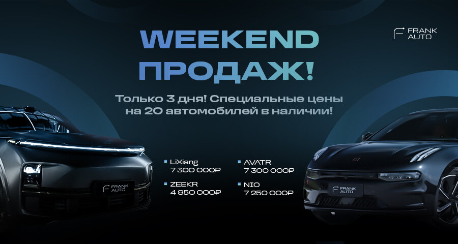 WEEKEND ПРОДАЖ! Акция продлится всего 3 дня! FRANK AUTO снижает цены на новые автомобили брендов Zeekr, LiXiang, Nio, Avatr, Porsche и Mercedes! Предложение действует пока автомобиль есть в наличии! • 20 невероятных автомобилей по специальным ценам • Дополнительная выгода за кредит и трейд-ин • Тест-драйв любого автомобиля • Бронь автомобиля по телефону на 2 часа • Пожизненная гарантия* Не упустите возможность приобрести автомобиль мечты по самой низкой цене в Москве! ZEEKR - 4 950 000 руб. LiXiang - 7 300 000 руб. AVATR - 7 300 000 руб. NIO - 7 250 000 руб. Porsche - 13 900 000 руб. Mercedes Maybach - 27 900 000 руб. Забронируйте автомобиль прямо сейчас! 👉🏻Подробности акции *Пожизненная гарантия предоставляется на основную электробатарею. На остальные узлы и агрегаты гарантия предоставляется life insurance на 3 года.