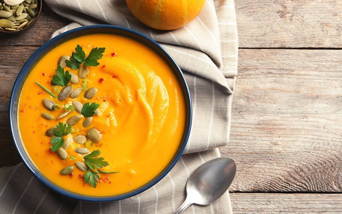 Тыквенный суп — это оригинальное и вкусное блюдо из тыквы, которое очень популярно в осеннем меню многих мировых ресторанов. Аппетитная оранжевая тыковка так и просится стать основой для ароматного и яркого супа. Он полезен и малышам и их родителям, благодаря богатому содержанию витаминов. А вкуснятина какая, честно, сама не ожидала, но суп очень насыщенный, сытный и вкусный! Ингредиенты Тыква 500 г Лук репчатый 1,5 шт. Чеснок 6 зубчиков Тимьян свежий 4 веточки Сливки 20 % 150 мл(можно заменить жирной сметаной) Лимон 1 шт. Растительное масло 20 мл Соль Перец по вкусу Украшение: Тыквенные семечки очищенные 20 г Кинза 2 веточки Сливочное масло 40 гр. Приготовление 1. Разрезать тыкву, нарезать на крупные кусочки и очистить от кожуры. Нарезать мякоть тыквы на мелкие дольки. 2. Лук очистить и нарезать соломкой. 3. На разогретую кастрюлю налить 20 мл растительного масла и обжарить лук до золотистого цвета. 4. Зубчики чеснока очистить, раздавить ножом и отправить к луку, с