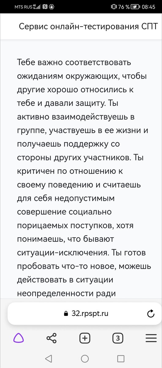 Хотя нет у меня этих слов. Проходят это тестирование (социально-психологическое) двое совершенно разных детей. Проходят с чувством, с толком, вопросы читают, задумываются как ответить, а результат у них одинаковый. Слово в слово. Примерно такой: Потом какой-нибудь деть просто берет и практически не глядя тыкает ответы на вопросы. И у него результат тот же. Нет, я понимаю, что современные дети порой таблицу умножения не знают, но они её не знают, потому что выучить лень, а не потому что интеллектом не вышли. И когда они видят такое поразительное сходство в интерпретации ответов людей, которые отвечали на вопросы по-разному, то определённые выводы делают. И выводы эти не в пользу теста. В итоге станут эти дети в следующем году нормально отвечать на вопросы? Не станут. Зачем тогда все это нужно?
