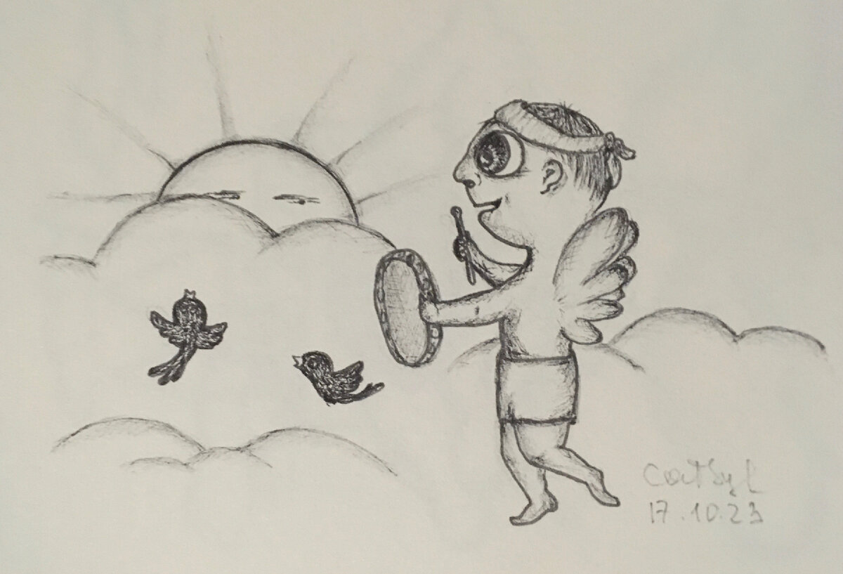 Тема 13 октябрьского марафона - Подъём. У меня подъём Солнца. Оно же однозначно поднимается каждое утро. А кто его поднимает? Я нашла ответ - ангел с бубном. Наверное, Солнцу тоже трудно каждое утро вставать и дарить свой свет людям, которым и в голову не прийдет поблагодарить его за такую ответственную работу. Если не находите в жизни ничего хорошего, посмотрите на Солнце - оно ещё с нами. #Inktoberdzen