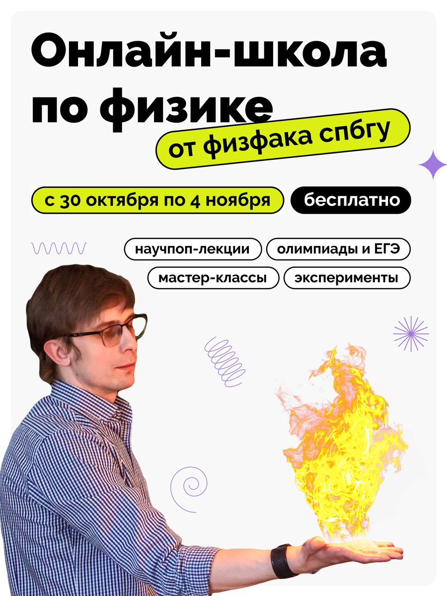 Проведи неделю в атмосфере изучения удивительной науки — физики! С 30 октября по 4 ноября мы расскажем и покажем, что физика «из учебника» здесь, рядом, вокруг нас каждый день! В программе школы: Во время обучения вы можете обращаться за помощью к кураторам - студентам физического факультета СПбГУ, с которыми вы точно не заскучаете и сможете пообщаться на любые темы: поступление, экзамены, школа и многое другое. Чтобы СТАТЬ УЧАСТНИКОМ осенней онлайн-школы: Учебный план ориентирован на учеников с 8 по 11 классы, занятия будут проводиться в первой половине дня, ориентировочно с 11 до 14 по московскому времени, все лекции и семинары будут также доступны участникам школы в записи. Заявки на участие принимаются до 22 октября.