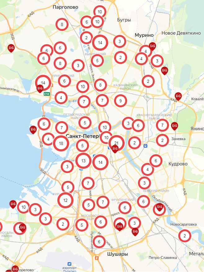 На 1й картинке - карта расположения КБ в Санкт-Петербурге. На 2й - для наглядности - взят участок примерно 2х2 километра и показано расположение магазинов. Исторический открыточный центр города, в котором магазины КБ нередко располагаются черед один дом!
