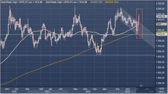 Цены на нефть и газ также выросли с момента начала конфликта Израиля и ХАМАС. График цены золота интервалами в 1 неделю Цены на золото вчера вечером достигли пятимесячных максимумов около 2000 долларов за унцию, поскольку война между Израилем и ХАМАС и более широкие экономические проблемы продолжали оказывать влияние на сырьевые рынки. Цена на золото выросла примерно на 160 долларов за унцию с начала конфликта в этом месяце, достигнув 20 октября отметки в 1997 долларов, поскольку эскалация напряженности приводит к бегству инвесторов в «безопасную гавань». «Люди бросились в золото с целью обрести чувство безопасности среди геополитических рисков. Если произойдет эскалация конфликта на Ближнем Востоке, цены на золото превысят $2000», — заявил Филипп Стрейбл, главный рыночный стратег компании Blue Line Futures в Чикаго. Цены на нефть также в пятницу достигли самого высокого уровня с начала военных действий: нефть марки Brent вырастала в цене до 93,79 доллара на внутридневных торгах. Вчера