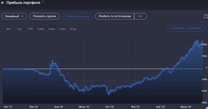 Исторический отчет по нашему Собственному Пенсионному Фонду (СПФ), впервые за 20 месяцев я не инвестировал ни рубля на Фондовый Рынок, сейчас расскажу в чем дело. Но сначала давайте подведем итоги за этот период. Результаты СПФ – Август 2023 1. Общая сумма вложений: 877 967,76₽ 2. Стоимость портфеля: 1 105 452,14₽ 3. Прирост портфеля в ₽: 227 484,38₽ 4. Прирост портфеля в %: 25,9% 5. Общая сумма комиссий: 616,28₽ 6. Время с момента начала инвестирования: 22 мес 7. Сумма, внесенная на ИИС с начала года: 135 000₽ 8. Дивиденды: 487₽+0,06$ В этом месяце поступили дивиденды от Сургутнефтегаза 487₽, а также продолжают по кусочкам приходить дивиденды от Dell Technologies 0,06$. Сумма замороженных активов в августе составила 398 872,94₽ или 36% от стоимости портфеля. <> РЕЗУЛЬТАТЫ СПФ 1 год: https://t.me/CaptainDiary/66 СПФ за прошлый месяц: https://t.me/CaptainDiary/131 Итак, почему я прервал длинную дисциплинированную серию ежемесячных инвестиций? На это повлияло 2 события: 1) Я уже не ра