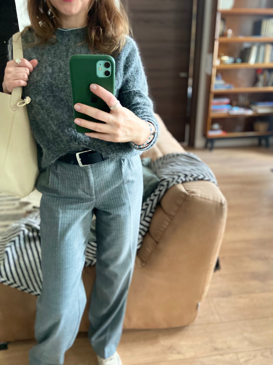 Всем привет! Еще летом я вам показывала видео из «Лавки радостей» на Цветном бульваре. Показывала ее в этом видео Я тогда купила это шерстяной пушистый свитер от «Lusio» за 600- Серый цвет-один из любимых мною, его очень просто сочетать со всем Вот такой замкнутый образ у меня получился. Вверху и внизу бежевый цвет-это то, что очень часто стала применять. Уже осень, а я все никак не могу убрать эту молочную сумку-мешок, такая она удобная Серые брюки (в составе шерсть) показывала много в последних обзорах. Серый цвет я много видела в обзорах на итальянских витринах у Яны Скворцовой (канал Мода и стиль минимализм), справа прям точь в точь мой свитер. А на витрине слева серый костюм в полоску, брюки прям очень на мои похожи. А потом на просторах интернета я встретила его за 18 тысяч, представляете? И как здорово смотрится с рыжим? Тотал серый образ получился в примерочной магазина «Фамилия». Очень часто я захожу в примерочные и составляю образы, фотографирую, чтобы понять, какой одеж