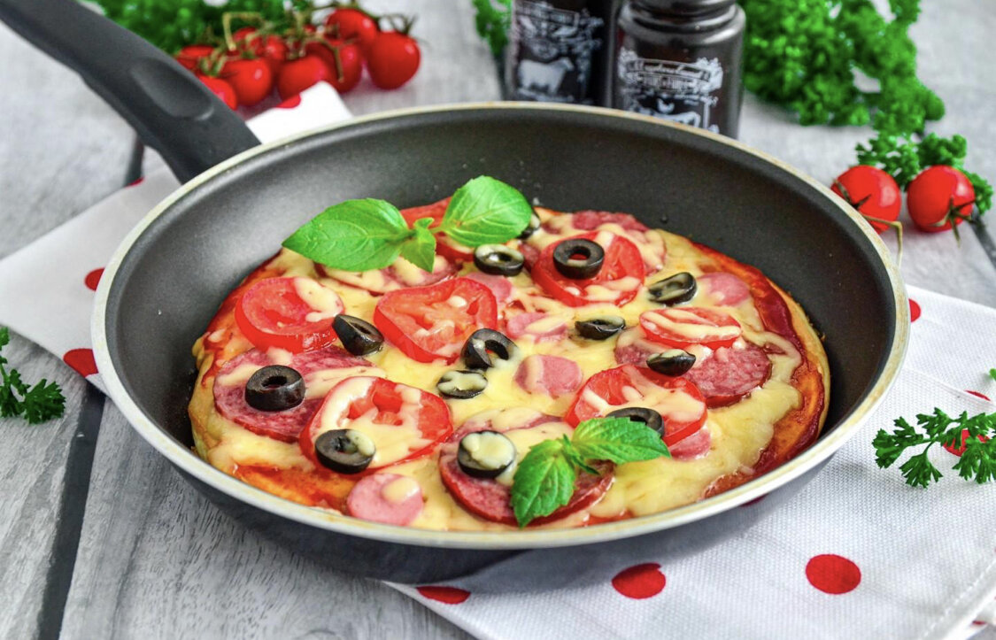 Шаг 1. Как сделать пиццу на сковороде за 5 минут? Подготовьте продукты. Кефир подойдет любой жирности. Его и муку измеряйте стаканом объемом 250 мл. Данный рецепт рассчитан для сковороды диаметром 28см. Тогда пицца получается с тонким тестом. Если вы любите более толстую основу, или увеличьте количество продуктов, или возьмите сковороду поменьше. Шаг 2. Помидор помойте и нарежьте на тонкие колечки. Вы можете взять несколько помидорок черри. Их разрежьте пополам. Шаг 3. Колбасу можете положить совершенно любую — вареную, копченую, ветчину, сосиски, сардельки. Нарежьте ее на тонкие ломтики. У меня сервелат и сосиска. Шаг 4. Маслины также нарежьте колечками. В качестве наполнения для пиццы еще можно взять грибы, вареную или копченую курицу, мясо, соленые огурцы и любую зелень. Я обычно зелень кладу уже на готовую пиццу, но это дело вкуса. Шаг 5. Сыр натрите на крупной терке. Сыр для этого блюда подойдет любой — твердый, полутвердый, мягкий, типа моцареллы. Главное, чтобы он был вк