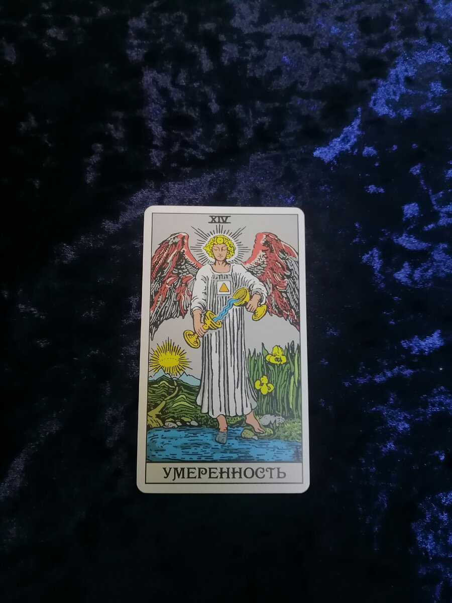 На карте показан ангел, лоб которого украшает знак солнца, а грудь - знак семерицы, изображённый в виде треугольника, помещенного в квадрат. Ангел является существом бесполым, лишённым и мужского и женского начала. Он переливает из одной чаши в другую субстанцию жизни. Одна нога ангела твёрдо стоит на земле, вторая чуть опущена в воду. Это положение демонстрирует сущность субстанций. На задний план уходит тропа, к сияющему свечению, в лучах которого видны очертания короны. Карта сочетает в себе знаки, говорящие о круговороте времен года, а также круговороте жизни. Карта символизирует нечто, создающее гармонию между физической и духовной сущностью человека. Основное значение карты - нужно обрести то самое равновесие и умеренность, которые помогут в достижении любых, даже самых невероятных целей!