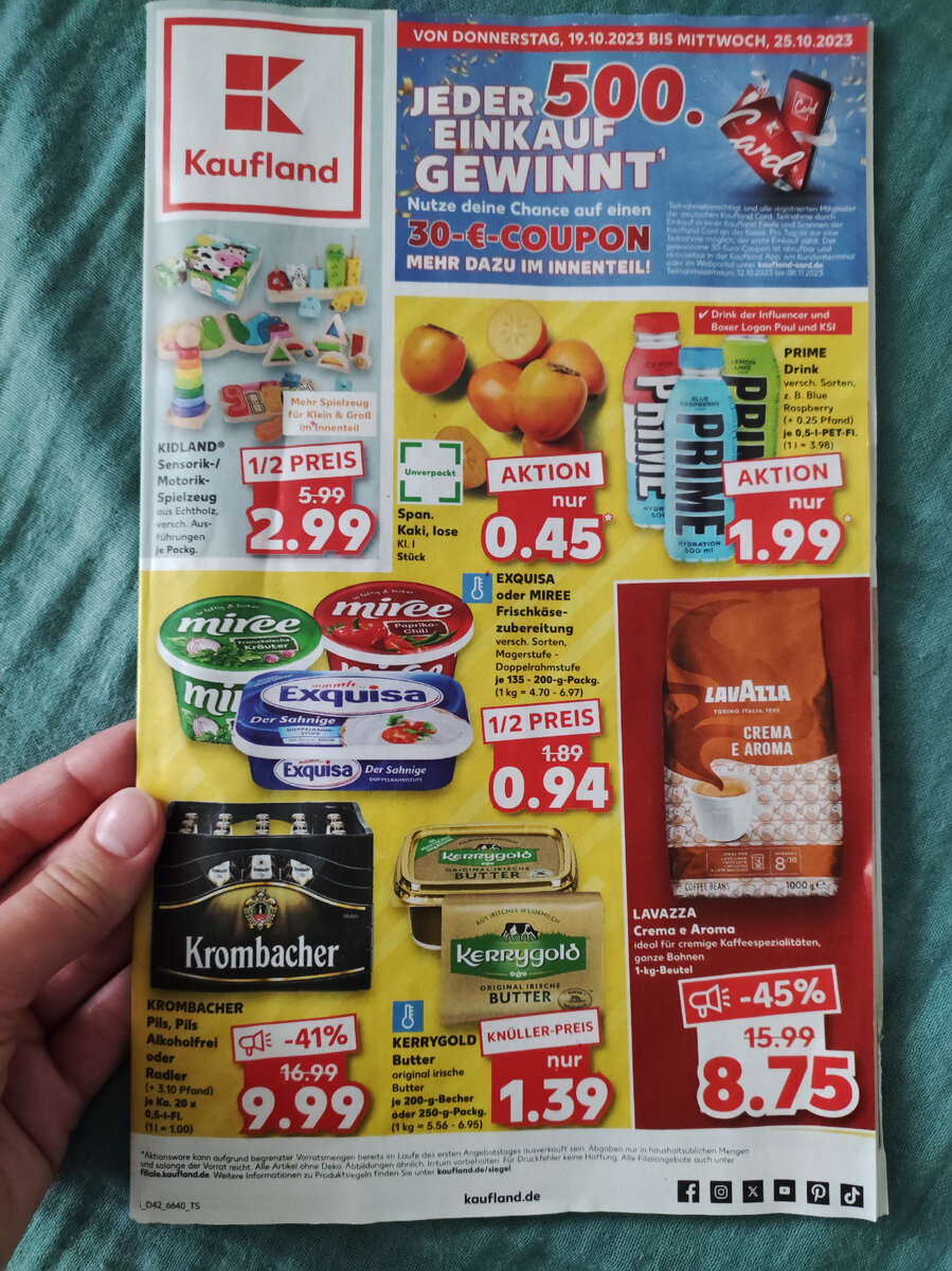 Кстати, в каждом сетевом магазине каждую неделю проходят всяческие акции на определенные продукты. Поэтому в магазинах всегда встречается продукция не по регулярной цене, а по акционной. С акционными каталогами можно ознакомится либо в интернете, либо прихватить каталог в самом магазине, а также каждую неделю их приносят в печатном виде на дом. Ниже пример каталога одной сети гипермаркетов, которая представлена, кстати, не только на немецком рынке, но и в Болгарии, Польше, Чехии и других странах. Цены при этом, конечно, в них различаются.