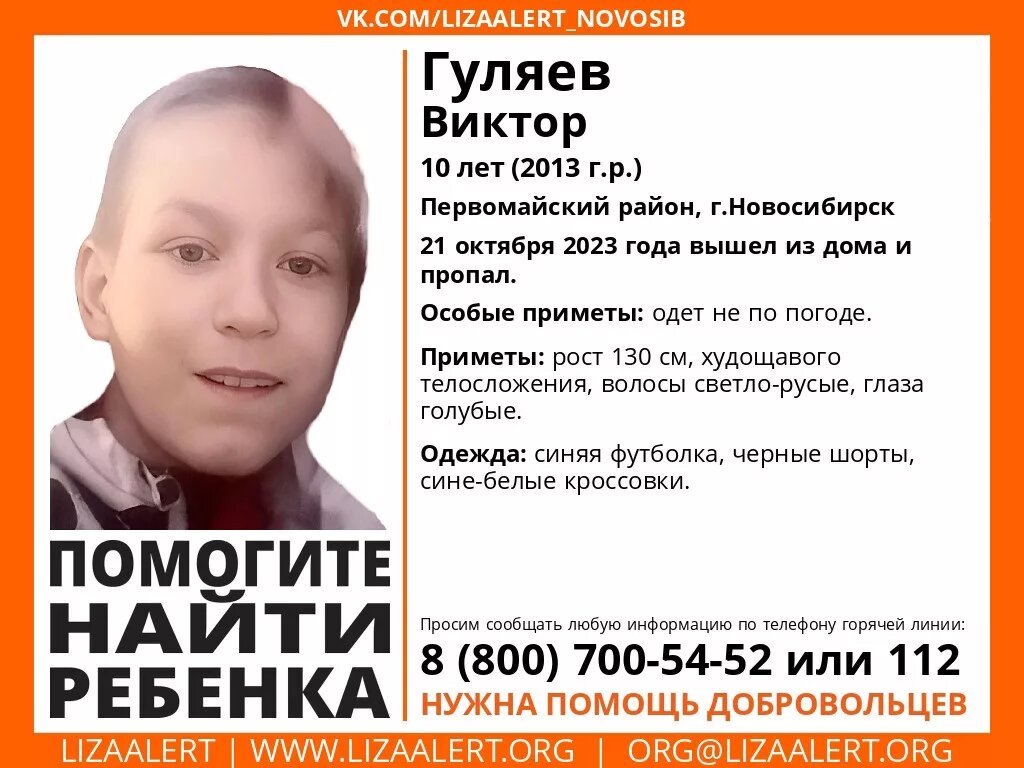 В Новосибирске пропал 10-летний Виктор Гуляев. Мальчик вышел из дома в неизвестном направлении 21 октября в Первомайском районе, сообщает поисковый отряд «ЛизаАлерт».