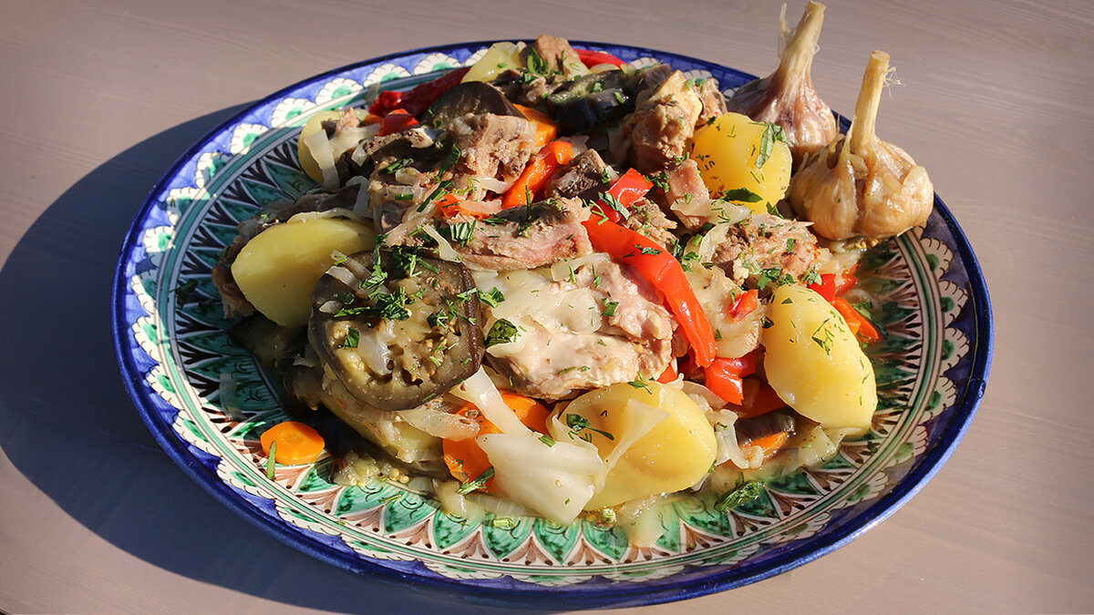 По-русски назвал бы овощным рагу, но нет...) Ингредиенты : мясо (желательно, жирное) 0,5 кг глук репчатый 1-2шт. картофель 2-3шт. морковь 1-2шт. перец болгарский 1-2шт. капуста по вкусу помидоры 2-3шт. зелень по вкусу соль и перец по вкусу зира (кумин) (по желанию) по вкусу базилик (по желанию) по вкусу Приготовление : Дно казана покрыть листьями капусты. На капусту выложить куски посоленного мяса - говяжьей или телячьей грудинки, бараньих ребрышек и т.п. (к баранине можно добавить немного курдючного сала). Затем - лук репчатый большими дольками, половинки картошки, морковь, разрезанная на 2-3 части, перец болгарский крупными дольками, крупные ломти капусты с частью кочерыжки. Затем - слой помидоров, разрезанных на 4-6 долек и хорошо посоленных. Густо посыпать помидоры нарезанным укропом или другой зеленью. Добавить зиру и базилик (или другие пряности по вкусу). Все закрыть большими листьями капусты. Воду не добавлять. Казан поставить на огонь, плотно закрыть тяжелой крышкой и