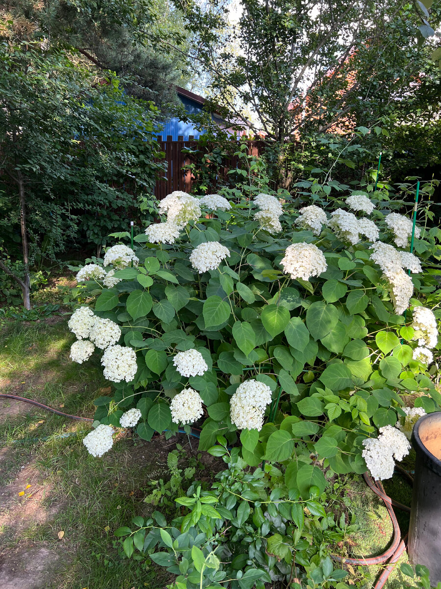 Только осенью и никогда не оставляю это на весну. Как-то однажды, весной решила чуть укоротить одну веточку, типа выбилась из строя. И чуть ли не пластырем пришлось заклеивать текущий сок из раны. Я долго извинялась, что случайно порезала ее и больше никогда этого не делаю весной Называю я ее «мамина гортензия», привезла ее малышкой с маминой дачи и посадила за гаражом. Так и растет она там сама по себе. Сейчас появилось много разных сортов древовидных гортензий и красивые такие, но места уже нет. Моя белоснежка с крупными шапками и крепкими стволами Никогда не позволяет себе валяться на земле даже после самого сильно дождя. Перед соседкой малиной, наверное, стыдно)). Древовидная гортензия просыпается весной самая первая. Уже в конце марта, когда еще лежит снег, у нее набухают почки и резать поздно. Ну и осенью она отцветает не рано, вместе с метельчатыми. Это она в середине октября. Тем не менее, даже еще цветущую я обрезаю, чтобы успеть до заморозков. Обрезаю не очень низко. Наш