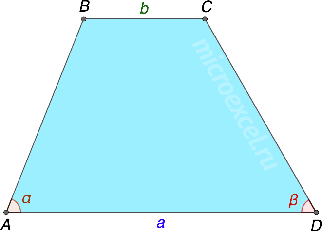 Трапеция – это четырехугольник, две стороны которого параллельны, а остальные две – нет. Параллельные стороны называются основаниями трапеции (AD и BC), две другие стороны – боковыми (AB и CD). Угол при основании трапеции – внутренний угол трапеции, образованный ее основанием и боковой стороной, например, α и β. Трапеция записывается путем перечисления его вершин, чаще всего, это ABCD. А основаниям обозначаются маленькими латинскими буквами, например, a и b. Средняя линия трапеции (MN) – отрезок, соединяющий середины ее боковых сторон. Высота трапеции (h или BK) – это перпендикуляр, проведенный от одного основания к другому. Виды трапеций Равнобедренная трапеция Трапеция, боковые стороны которой равны, называется равнобедренной (или равнобокой). AB = CD Прямоугольная трапеция Трапеция, у которой оба угла при одной из ее боковых сторон прямые, называется прямоугольной. ∠BAD = ∠ABC = 90° Разносторонняя трапеция Трапеция является разносторонней, если ее боковые стороны не равны, и ни один