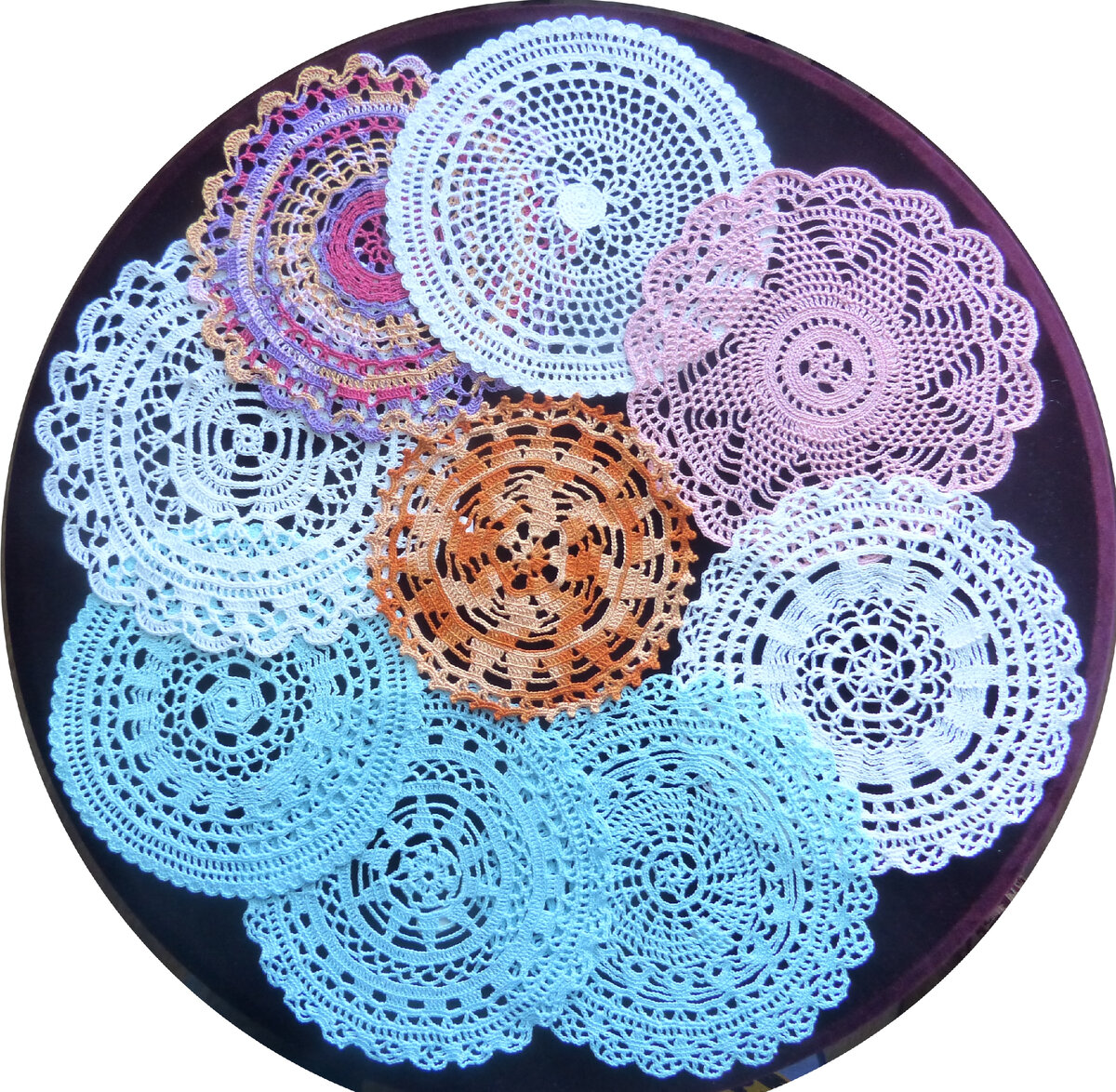 В 1846 году появились 4 книги миссис Гогейн, в которых были представлены круглые салфетки и кружевные обвязки. Три маленьких книжечки были с гравюрами, что очень помогало разобраться с описаниями. Эти салфеточки представлены на обложке 1 части моей книги. Всего в этих книгах есть описания 21 салфетки, все показать невозможно, показаны 6 салфеток. Рисунок 1 салфетки на 8 секторов, и она единственная с таким расположением, остальные салфетки построены концентрическими слоями с разными количествами повторений в каждом слое. Следующая салфетка – пример концентрических слоев: в первом слое 6 повторов, во втором слое 18 повторов, а в 3 слое – 28. Несмотря на простоту этих салфеток, они обладают прелестью первозданности, прелестью первых опубликованных кружев. Предлагаю Вам связать салфетку, описания которой нет в книге. Салфетка крючком №7 1 ряд. 6ВП замкнуть в кружок.