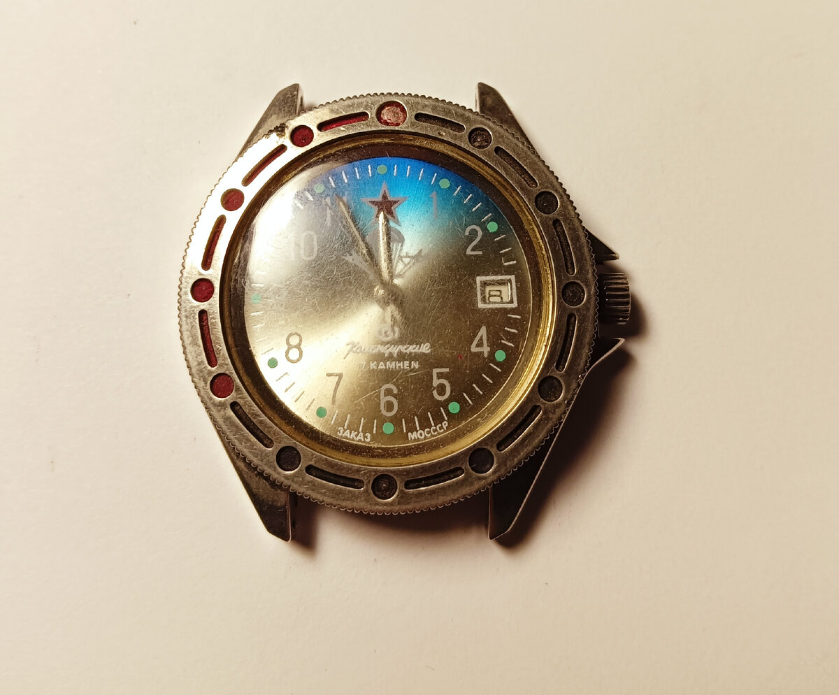 Доброго времени суток! В ремонт принесли вот такие часики, владелец попросил восстановить т.к. часы память об отце. Очень удивился когда узнал что часы китайская копия наших Командирских. Задняя крышка также пытается копировать наши часы. Открутил заднюю крышку - она на резьбе, имеется резиновое колечко на крышке. Механизм так называемый Orientex. Это сравнительное фото с нашими Командирскими. Конечно надписи на циферблате это отдельная тема, мало того что это Заказ МОСССР, так еще и 17 камнеN , неужели не могли нашу букву найти? Снял стрелки. Снял циферблат, держится циферблат на двух липучках. Баланс неисправен, нет колонки крепления спирали. Разобрал механизм, ему нужна чистка. Детали корпуса отправляю в мойку. Порылся в старых запчастях в поисках исправного маятника. Нашёл хороший баланс в сборе. Посмотрим как он подойдёт. Собрал механизм и установил баланс - часы идут. Баланс вполне себе подошёл. Собираю календарное устройство. Календарь собрал - всё чётко работает. Стекло отполи