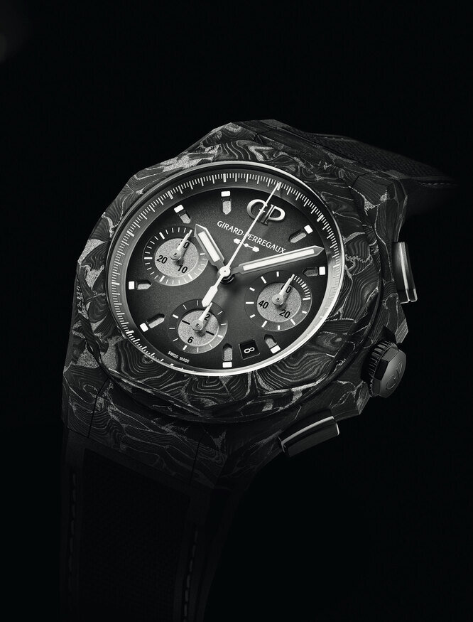 Главный тренд выставки Geneva Watch Days 2023 — новый чёрный; наиболее интересные решения, от углеродно-титанового композита до нанотрубок Упражнения с лентами Laureato Absolute 8Tech оснащены мануфактурным калибром GP03300- 1058 с хронографом и автоподзаводом. Запас хода 46 часов Архивы пресс-службы С момента появления Laureato Absolute мануфактура Girard-Perregaux регулярно применяла инновационные материалы: металлизированное сапфировое стекло, стеклоуглерод, каучуковый сплав и так далее. На этот раз дело дошло до углеродно-титанового композита. Материал корпуса состоит из однонаправленных, нетканых и предварительно пропитанных расплавом, содержащим порошок титана, углеродных лент толщиной всего 0,05 мм. Эти ленты накладываются друг на друга в произвольном порядке, образуя «стеллажи», которые затем разрезаются на восьмиугольники. Эта технология впервые применена в часовом производстве. Так получился корпус новых Laureato Absolute 8Tech. Верхний слой циферблата подвергли