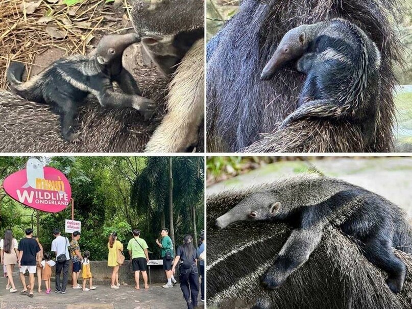 Хорошие новости из зоопарка Као Кео в Си Раче — 27 сентября у них родился гигантский муравьед. Очень важное и редкое событие для этого вида животных. Родителями стали 9-летняя Кармела и 12-летний Сантьяго. Спустя 3 недели малыша показали посетителям зоопарка, но только издалека, чтобы не тревожить защитные инстинкты матери. Пол новорождённого муравьеда пока нельзя определить, поэтому имя ему ещё не придумали. Зооработники и ветеринары продолжают внимательно следить за мамой и малышом.