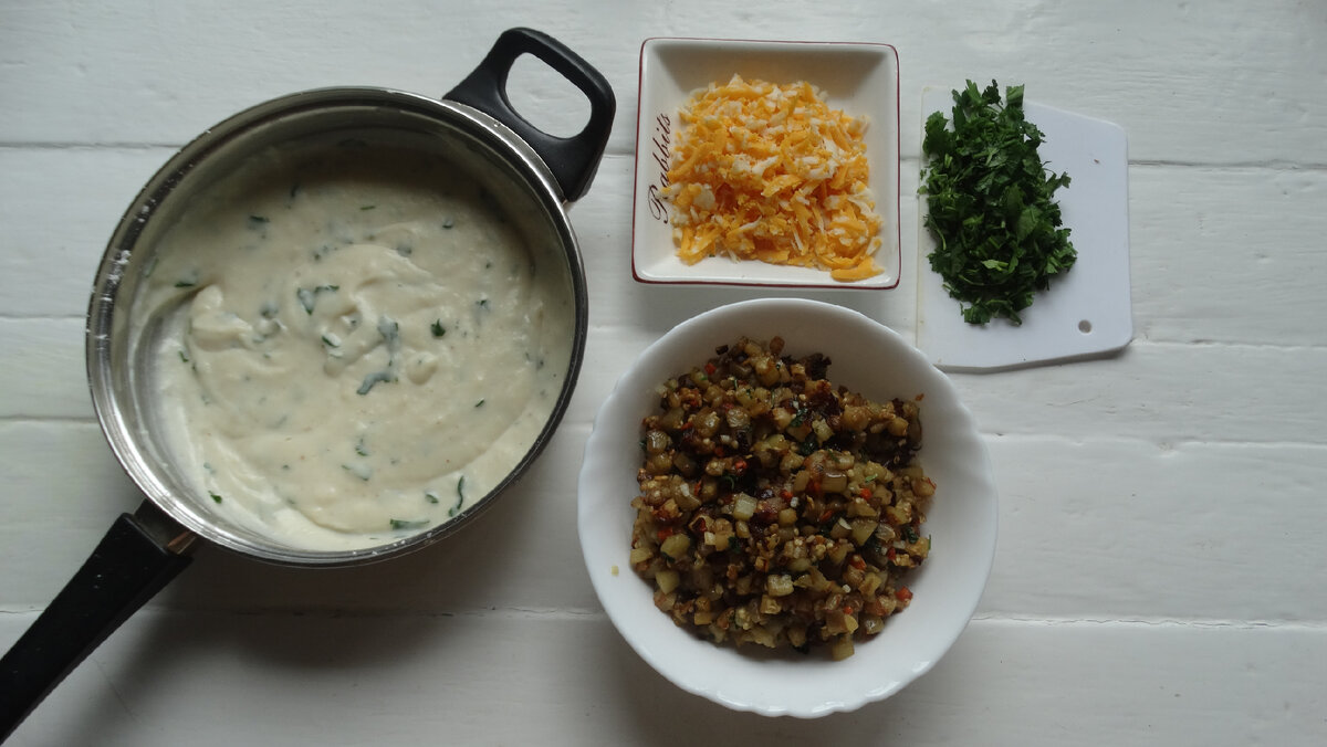 Я набила руку на грибном жюльене до такой степени, что решила начать экспериментировать. С чем я только не готовила жюльен. И самым вкусным оказался баклажанный вариант. Вообще, сочетание обжаренного баклажана с нежным соусом бешамель, потрясающее, просто нереальное. Я готовила это блюдо на праздник и гости даже не узнали в нём баклажаны, подумали грибы. А что самое интересное, традиционно жюльен подают в горячем виде. Но моя закуска понравилась мне еще больше, когда она полностью остыла. Оказалось, что и холодный жюльен классный (правда, я не знаю, это только с баклажанной начинкой или вообще с любой). Итак, что нужно для баклажанного жюльена «Арабская ночь»: 1) Соус бешамель (мука, молоко, сливочное масло и немного соли); 2) Баклажанная начинка (баклажаны, лук, чеснок, морковь, зелень, растительное масло и немного соли); 3) Сыр (очень качественный и вкусный). Я готовлю самый наипростейший соус, никаких особых специй и ингредиентов не добавляю. У меня нет в нем даже мускатного ореха