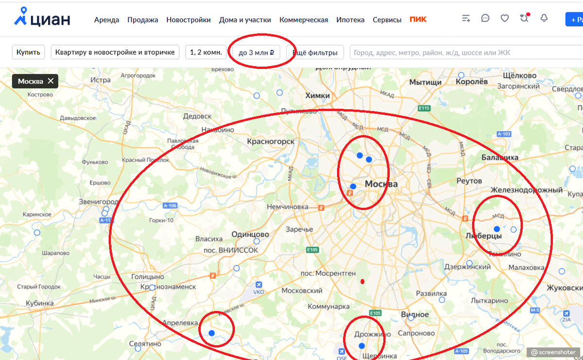 Простейший поиск на Циане выдает список, что ниже 3 000 000 руб. квартир нет вообще. Это при том, что мы не берем центр Москвы. Даже в Новой Москве на удалении 50-60км от МКАД ничего похожего просто нет. Циан не выдает такой список.