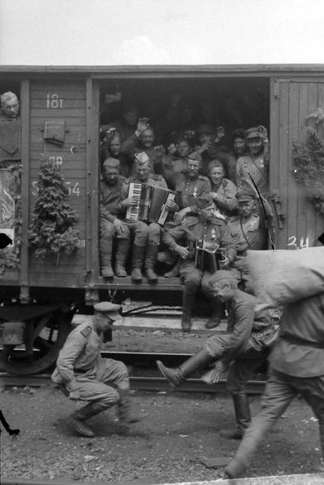 Рядом с перекрестком, в небольшом сквере дымит полевая кухня, раздаются звуки гармошки и веселый смех бойцов.
