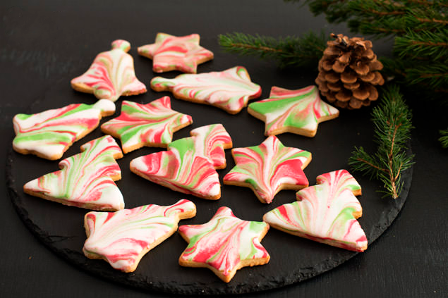 Если вы ищете простой рецепт рождественского печенья, который выглядит действительно впечатляюще, это печенье с мраморной сахарной пудрой может стать отличным выбором. Я просто влюбилась в эти удивительные эффекты мраморной глазури. Мне никогда не нравилось печенье с глазурью, пока я не обнаружил этот мраморный эффект. Делается быстро, легко, а печенье выглядит потрясающе. Сначала нужно приготовить тесто для сахарного печенья. После приготовления необходимо дать тесту остыть в холодильнике не менее 2 часов. Это обеспечит легкость раскатывания теста и сохранение формы печенья во время выпекания. Дайте сахарному печенью полностью остыть, прежде чем готовить королевскую глазурь. Для этой королевской глазури вам нужно смешать яичный белок до образования пены. Добавьте сахарную пудру, лимонный сок, ванильный или миндальный экстракт и перемешайте до белого и блестящего состояния. Возьмите примерно две столовые ложки глазури за раз и поместите ее в две разные миски. Добавьте красный и зеленый
