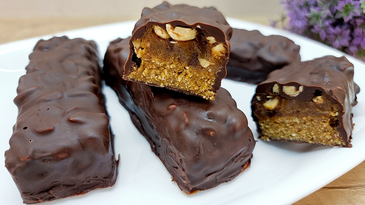 Вкусный и полезный десерт, а еще это быстрый перекус, который подкрепит силы, если до обеда еще далеко. Можно взять с собой на прогулку, дать детям в школу. Дети просто обожают эти шоколадные батончики! Я часто их готовлю. Сверху посыпаю либо арахисом, либо любыми измельченными орехами