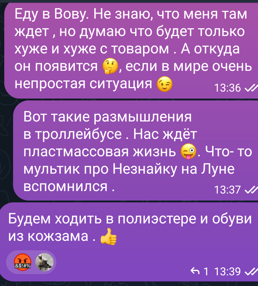Всем привет! Мой канал о секондовом шопинге и о "поболтать". Мой канал - это сообщество людей, объединённых любовью к поискам тряпочных сокровищ. А ещё мы любим просто поговорить. Вы сюда попали ? Если сюда, то добро пожаловать. Хейтеров на канале нет уже давно, здесь тепло и по-домашнему просто. Хочется даже налить виртуального чая. Ох и нелегкая это работа -стрим 😌 Предыдущие статьи, посвященные этому делу : Я не все публикую, потому что времени не хватает двойную работу делать. Да, есть недоброжелатели, но я уже переболела : кому что-то не нравится, тот ходит сам, ищет-рыщет и покупает за сколько хочет и может. Но ко мне без претензий. Ушла из дома в 9.50, а явилась вечером. Лежу такая на кровати и думаю... Нет , я не думаю. Мыслей нет. Помните , как у Олейникова : Трудно думать обезьяне, Мыслей нет — она поет. Таракан сидит в стакане, Ножку рыжую сосет. В этом шедевре я не обезьяна , хоть пою и мыслей нет. Я таракан. Ножку рыжую от куры- гриль сосу-грызу-кусаю. Лежа. По
