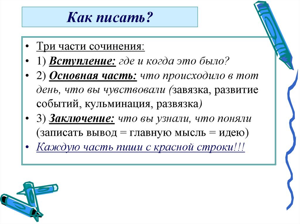 Начнём с того, что в любом сочинении есть главная мысль, которую важно уловить. Часто именно на эту тему и задают написать сочинение. Но бывают и исключения, когда нужно описать характер главного героя, или центральные образы нескольких персонажей. Вот здесь, как правило, и возникают ошибки. Если же требуется просто передать главную мысль, то достаточно действовать по схеме, представленной ниже. С этим заданием справились, а теперь давайте рассмотрим, какие же популярные ошибки совершают многие при написании сочинений. Самой распространённой ошибкой можно считать отступление от темы и перенасыщение ненужной и