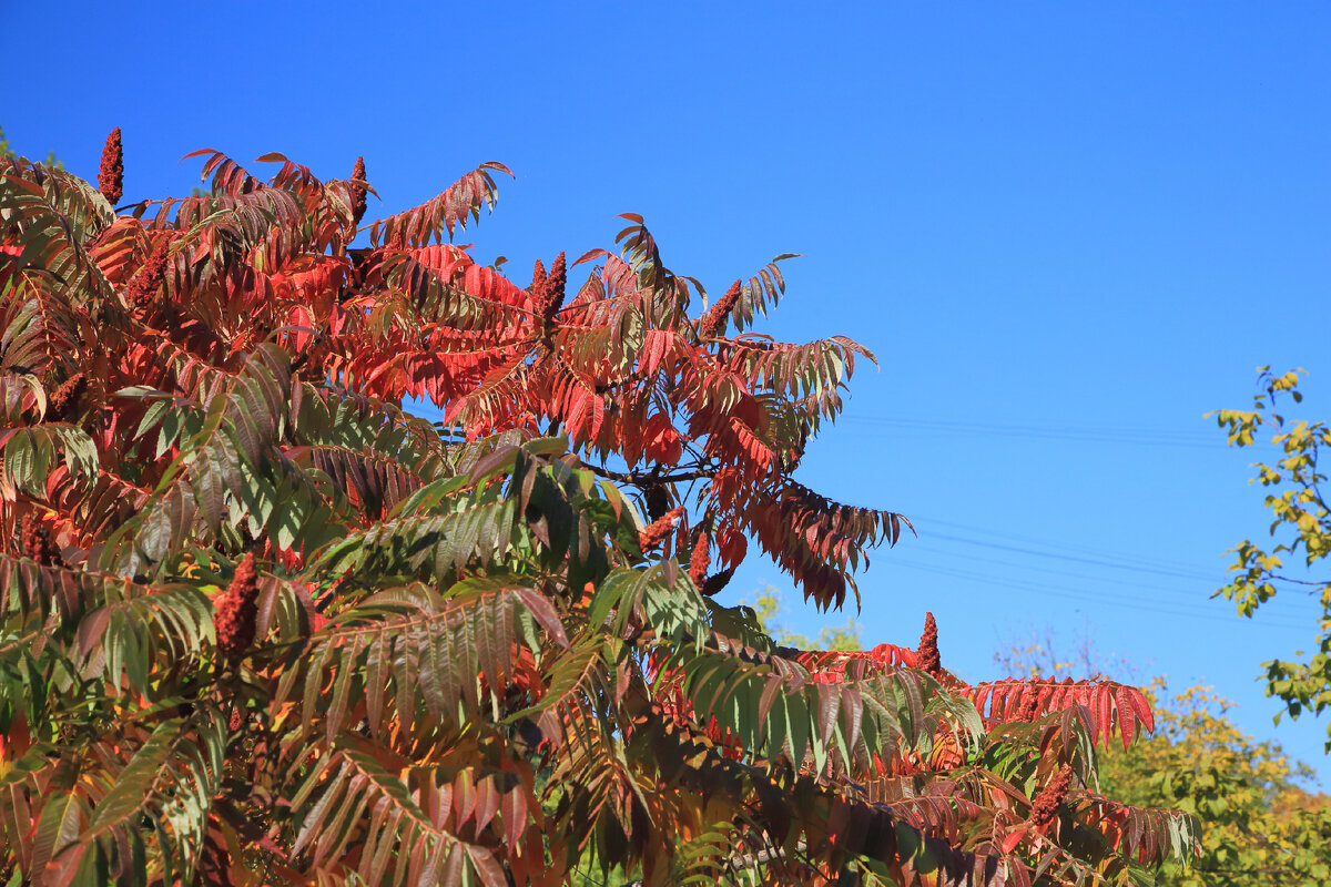 Там вы видели, что небо получилось какого-то несуразного цвета. Как сделать его голубым? Один из способов: использовать при съёмке поляризационный фильтр. Работает при чистом голубом небе. Время съёмки около 19.10.2023 12:45. Если солнце в спину, но немного в сторону, а полярик ориентирован так, чтобы небо выглядело темнее, то результаты примерно такие. Конечно, минимальная постобработка RAW применялась. Следующая съёмка сумаха будет, когда окрасится все.