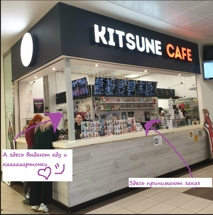 Кафе располагается на одном из этажей ТРЦ. Это часть фуд корта, там ходили милые промоутеры, одетые в костюмы героев аниме.